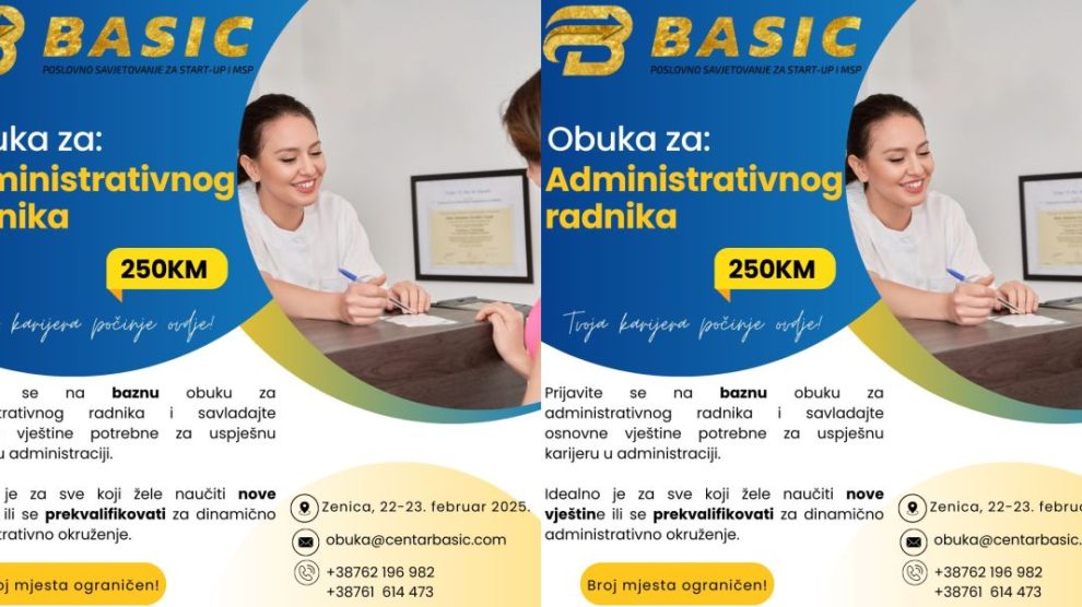 Prijavite se na obuku za administrativnog radnika i ostvarite priliku za profesionalni napredak! Šta ćete naučiti tokom obuke? Osnove administrativnog poslovanja Računovodstveni poslovi i radno-pravni odnosi Upravljanje dokumentacijom i rad u MS Office-u Razvijanje soft skills vještina:...