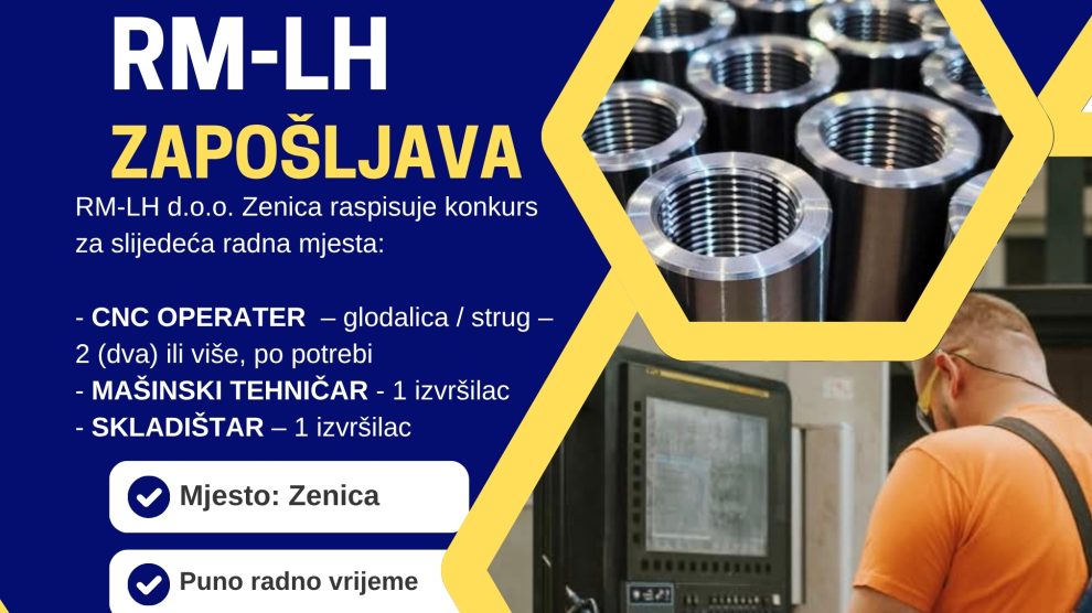 RM-LH d.o.o. Zenica raspisuje konkurs za slijedeća radna mjesta: CNC OPERATER – glodalica / strug – 2 (dva) ili više, po potrebi Kratak opis poslova: Postavljanje, programiranje i upravljanje CNC glodalicama i/ili strugovima prema tehničkoj dokumentaciji i zadatim radnim nalozima...