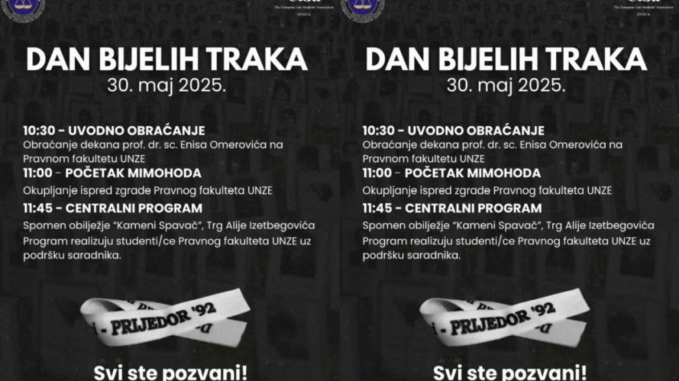 Pravni fakultet Univerziteta u Zenici (UNZE), u saradnji sa Evropskim udruženjem studenata prava – ELSA Zenica, nastavlja dugogodišnju tradiciju obilježavanja Dana bijelih traka, kao podsjećanje na zločine počinjene u Prijedoru tokom rata u Bosni i Hercegovini. U petak, 30. maja 2025...