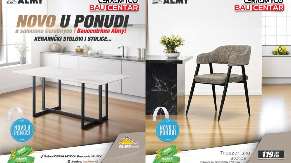 Osvježite svoj dom: Novi asortiman u salonima CERALMYCO i baucentrima ALMY!- NOVO U SALONIMA CERALMYCO I BAUCENTRIMA ALMY ✅ Trpezarijski stolovi i stolice vrhunskog kvaliteta ✅ Posjetite nas i odaberite dizajn koji vam najviše odgovara! ✅ Potražite i na www.almyshop.ba Saloni CERALMYCO...