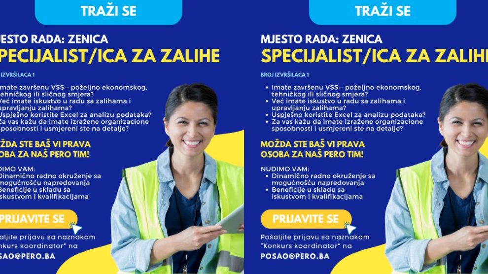 Oglas za posao- bKompanija PERO broji preko 120 zaposlenih u baucentrima u Neumu, Mostaru, Jajcu, Varešu, Zenici i Maglaju. Za nastavak naše uspješne priče trebaju nam vrijedni i pouzdani radnici jer su ljudi ključ našeg uspjeha. Na osnovu ukazane potrebe kompanija PERO Zenica d.o.o...