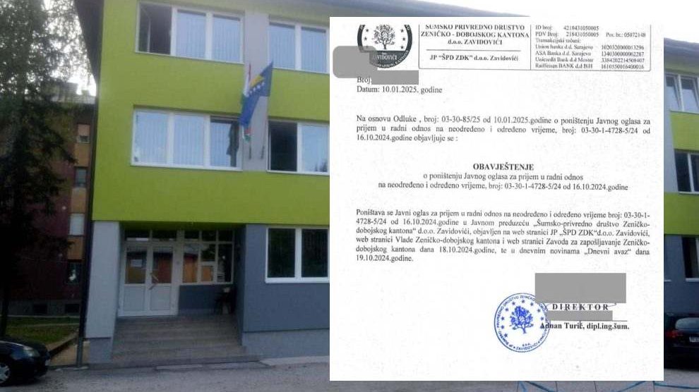 Kako ekskluzivno saznaje Zenicablog, direktor Šumsko-privrednog društva Zeničko-dobojskog kantona (ŠPD ZDK) Adnan Turić ispoštovao je večeras sinoć donesen Zaključak Nadzornog odbora ove firme, kojim se upravi ŠPD-a i njemu lično nalaže poništavanje Javnog konkursa za prijem četrdeset...