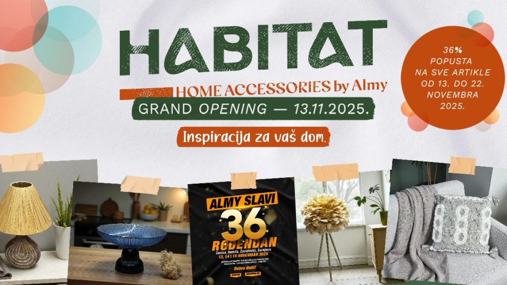 Novo poglavlje Almy priče: Otvara se Habitat — Home Accessories by Almy – Inspiracija za vaš dom!- Kompanija Almy sa ponosom obilježava 36 godina uspješnog poslovanja, a u sklopu rođendanskog slavlja, sutra, 13. novembra 2025. godine, bit će upriličeno otvaranje novog prostora — Habitat —...
