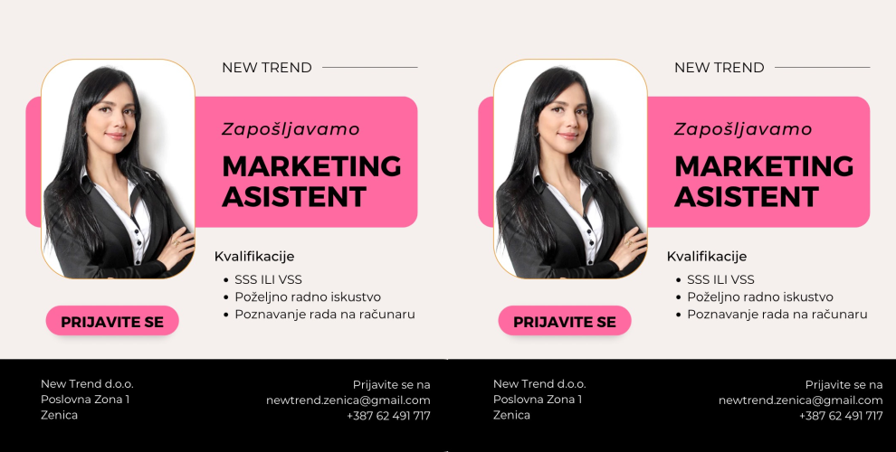 Agencija New Trend d.o.o., koja se bavi digitalni marketingom sa posebnim fokusom na video produkciju, proširuje svoj tim! U potrazi smo za dinamičnom i ambicioznom osobom koja će se pridružiti našem timu na poziciji Marketing Asistent. Kvalifikacije: • Završena srednja stručna sprema...
