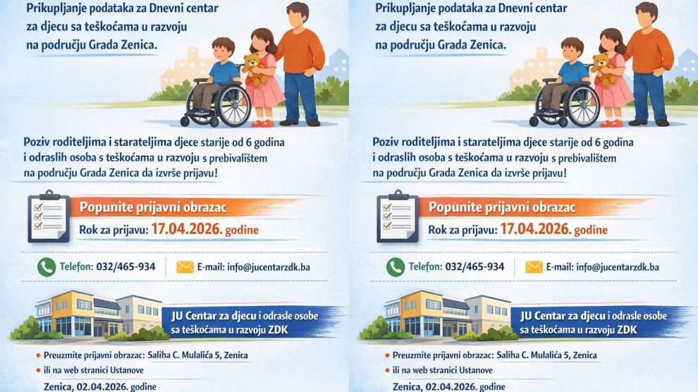 JAVNI POZIV- Obavještavamo javnost da je u toku proces prikupljanja podataka o potencijalnim korisnicima Dnevnog centra za djecu sa teškoćama u razvoju na području Grada Zenica. Tim povodom pozivaju se zainteresovani roditelji i staratelji djece i odraslih osoba sa teškoćama u razvoju sa...