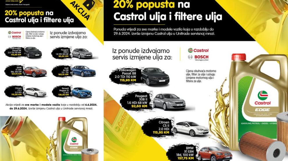 Ostvarite uštede uz akcijski popust od 20% na motorno ulje Castrol i filtere ulja koji traje do 29.6.2024. u Unitrade mreži servisa. Akcijski popust se ostvaruje na motorno ulje Castrol, te filtere ulja Bosch i Denckermann. Cijene i AKCIJA na mali servis u Unitrade centrima Od 6.6. do 29...