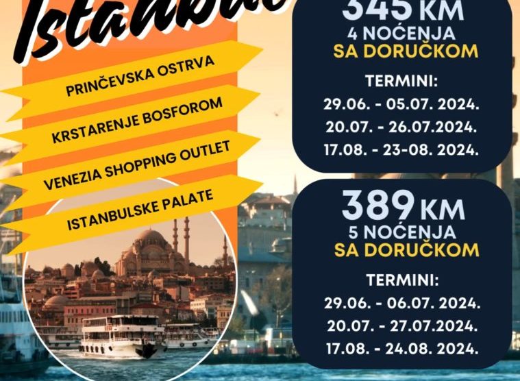 Doživite magiju orijenta – Putovanje u Istanbul: 4 noćenja sa doručkom za samo 345 KM HIT PONUDA – MAGIJA ORIJENTA DOŽIVITE AZIJSKU STRANU ORIJENTA, ISTANBULSKE PALATE I PRINČEVSKA OSTRVA HOTEL ★★★ /★★★★ Termini putovanja: 29.06. – 05.-07. 7 DANA – 4 NOĆENJA SA DORUČKOM 29.06. – 06...
