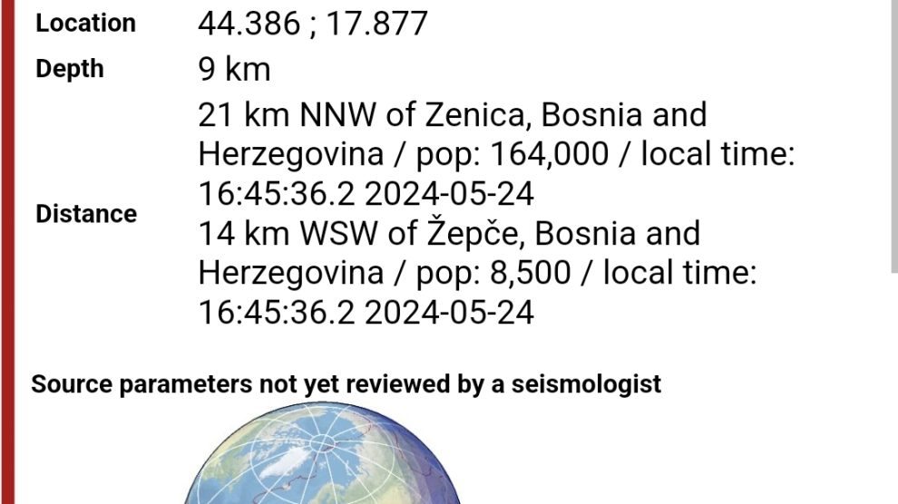 Kako je potvrdio EMSC, sjeverno od Zenice zabiljezen je novi jak zemljotres. Magnituda mu je bila 3.9 po prvim mjerenjima, ali se ti podaci koriguju naknadno. Epicentar je bio sjeverno-sjevernozapadbo od Zenice prema Žepču, na širem području Željeznog Polja, na dubibi 10 km. Više podataka...
