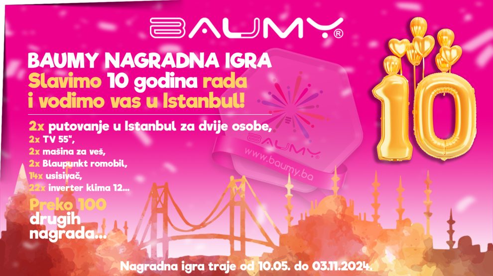 Nagradna igra: BAUMY slavi 10 godina- Učestvuj u BAUMY nagradnoj igri! BAUMY slavi 10 godina rada i vodi vas u Istanbul… Učestvovati možete kupovinom BAUMY proizvoda u minimalnom iznosu od 50KM u Baucentrima ALMY ili kod BAUMY ovlaštenih distributera. Račune sa imenom, prezimenom...