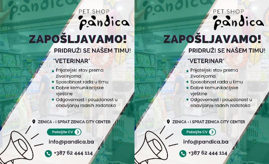 ‼️‼️Konkurs za Veterinara‼️‼️ Lokacija: Zenica Pet Shop Pandica raspisuje konkurs za prijem veterinara u radni odnos. Opis posla: * Savjetovanje vlasnika kućnih ljubimaca o zdravlju, ishrani i njezi * Priprema i administracija veterinarskih lijekova * Saradnja sa ostalim zaposlenima u...
