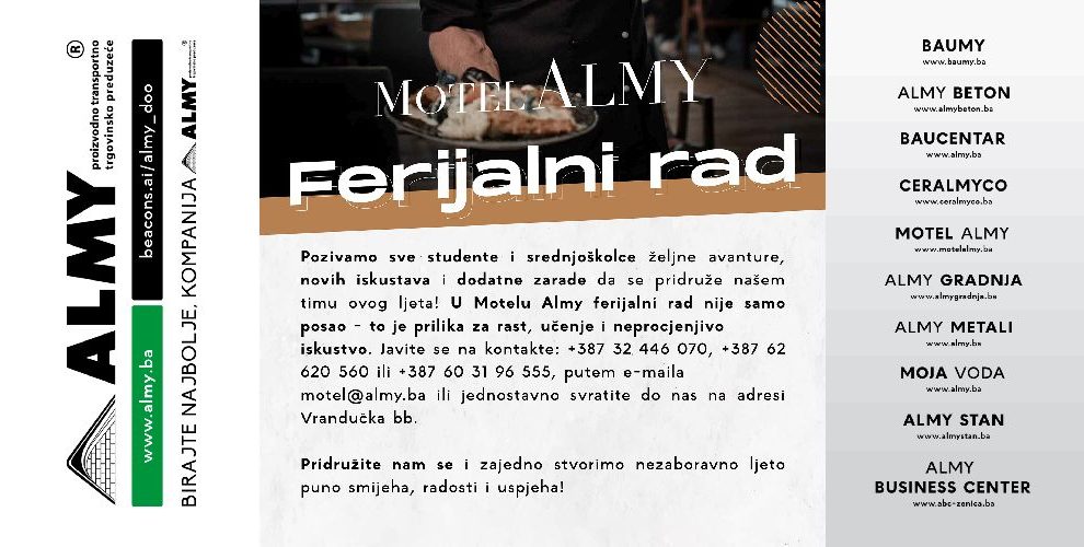 FERIJALNI RAD U MOTELU ALMY ZA SVE STUDENTE I SREDNJOŠKOLCE OVOG LJETA! Pozivamo sve studente i srednjoškolce željne avanture, novih iskustava i dodatne zarade da se pridruže našem timu ovog ljeta! U Motelu Almy ferijalni rad nije samo posao – to je prilika za rast, učenje i...
