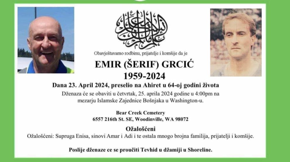 U američkom gradu Vudinvil (Woodinville), država Vašington (Washington), na Ahiret je u utorak preselio Emir (Šerifa) Grcić, bivši nogometaš NK Čelik i nekoliko bosansko-hercegovačkih i klubova iz Hrvatske, Srbije i Turske. Rođen je 1. januara 1959. godine, a u nogometnoj karijeri igrao...