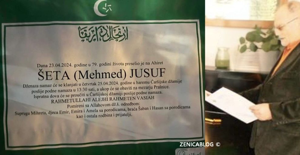 Danas poslije podne namaza, u 13.30 sati u haremu Čaršijske džamije u Zenici biće klanjana dženaza našem sugrađaninu Jusufu Šeti. Ukop će biti obavljen na mezarju Prašnice. Jusuf (Mehmeda) Šeta, preselio je u utorak na Ahiret u svojoj 79. godini. Iza njega su ostali supruga Mihreta, djeca...