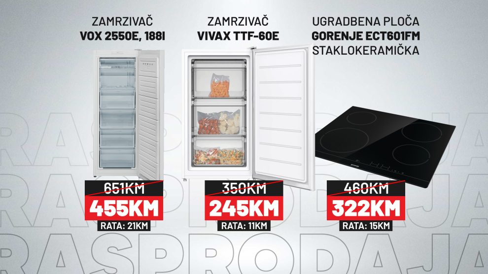U ProComp radnji bijele tehnike u Srpskoj mahali 45 u Zenici trenutno je u toku akcijska ponuda izdvojenih modela zamrzivača i ugradbenih uređaja po izuzetno povoljnim cijenama, uz mogućnost kupovine na rate. 1.Vivax TTF-60E – zamrzivač Cijena: 245 KM Na rate već od 11 KM mjesečno...