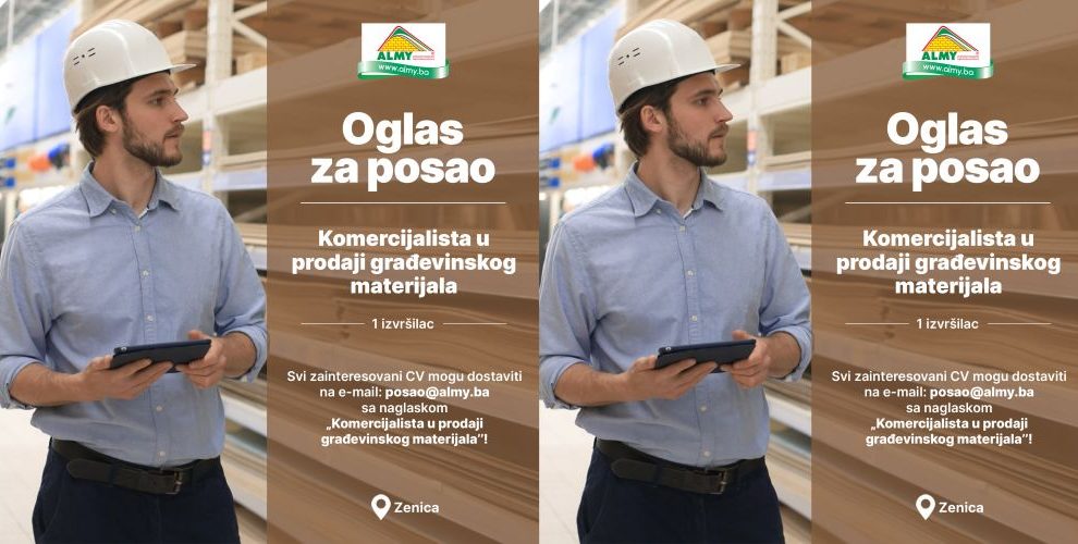 Oglas za posao: Komercijalista u prodaji građevinskog materijala- Almy d.o.o. Zenica objavljuje konkurs za prijem u radni odnos: POZICIJA: Komercijalista u prodaji građevinskog materijala LOKACIJA: Zenica BROJ IZVRŠILACA: 1 Uslovi: – SSS, – Obavezno radno iskustvo, poželjno na...