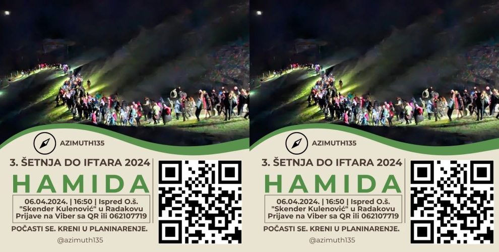 TREĆA #ŠETNJADOIFTARA 2024: HAMIDA Treća #ŠetnjaDoIftara 2024 posljednja je tura devetog ciklusa našeg najmnogoljudnijeg i najdražeg planinarskog projekta u Zenici. Okupljamo se u 16:50 na platou ispred osnovne škole “Skender Kulenović” u Radakovu. Ikindija se klanja u Bijeloj...