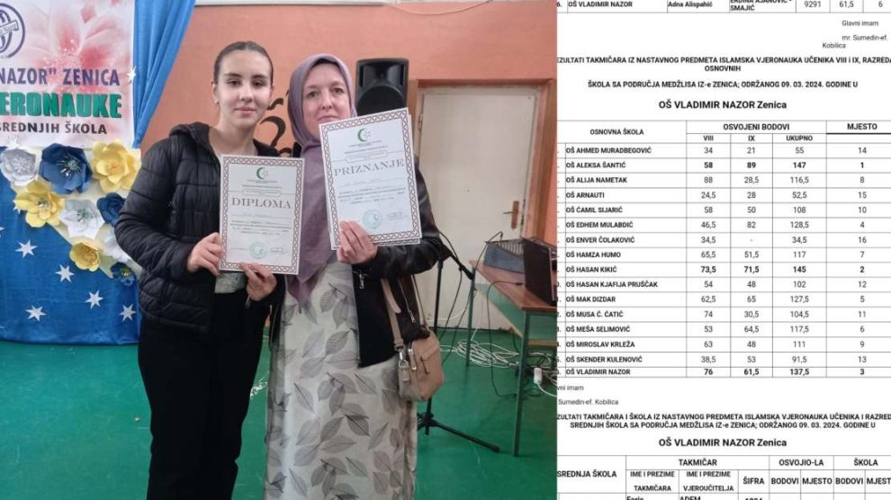 Na gradskom takmičenju iz Islamske vjeronauke održanom danas je Emela Kasapović iz Osnovne škole “Aleksa Santić” zauzela prvo mjesto u kategoriji učenika IX razreda. Čestitamo Emeli i nastavnici Melihi Ramović, saopćila je škola. U ukupnom plasmanu ova škola je zauzela 1...
