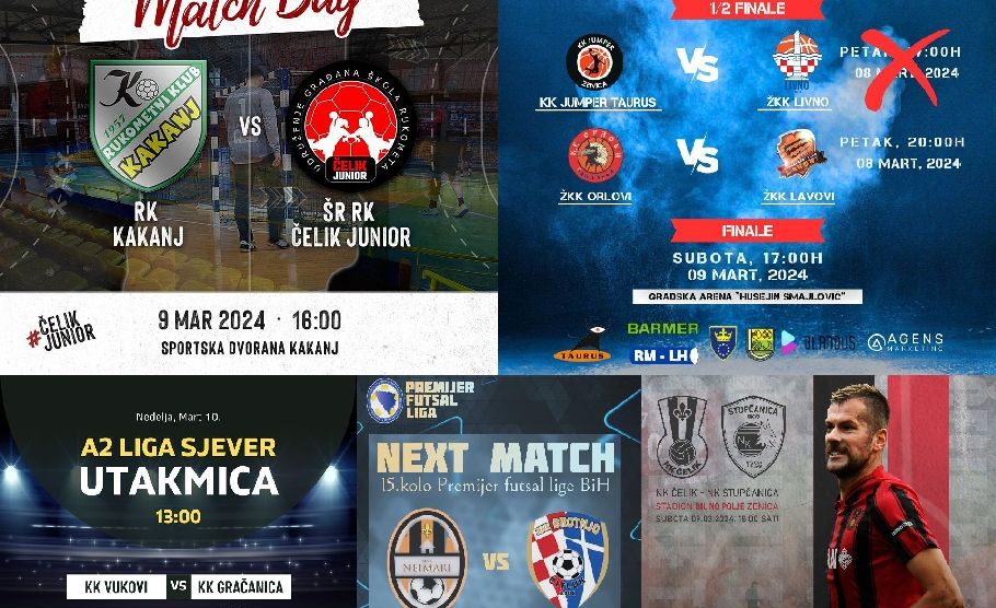 Donosimo Raspored utakmica zeničkih ekipa, te drugih ekipa i takmičenja od ovog petka, 8.3. do nedjelje, 10.3., do kojeg smo uspjeli doći: PETAK, 8.3.2024.godine 17 sati, Zenica, Drugi osmomartovski šahovski turnir (Šahovski dom u Zenici); 20 sati, Zenica: ŽKK Orlovi – KK Lavovi...