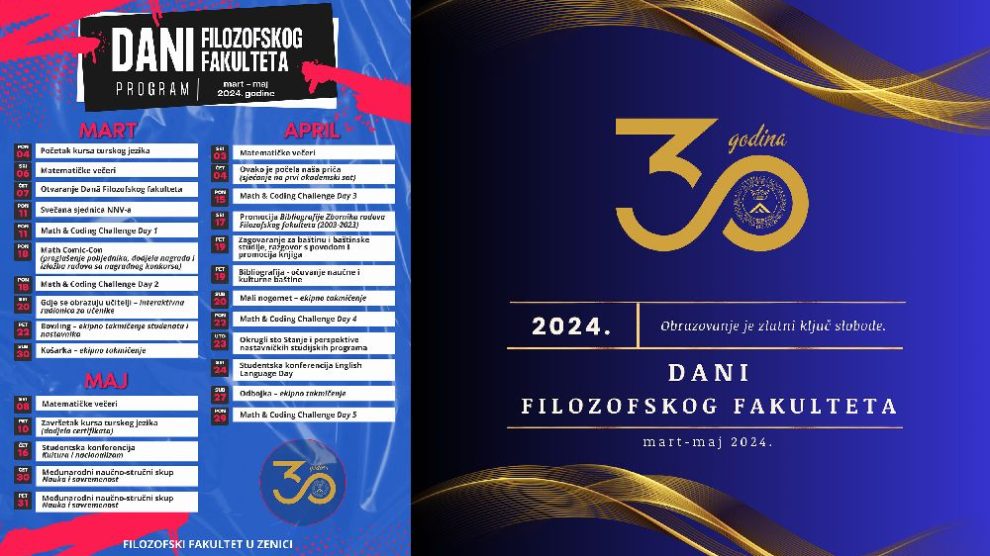 Svečano otvaranje Dana Filozofskog fakulteta Zenica održat će se u četvrtak, 07. 03. 2024. godine sa početkom u 11 sati u prostorijama Filozofskog fakulteta Zenica (Zmaja od Bosne 56). Filozofski fakultet Univerziteta u Zenici u 2024. godini slavi 30 godina rada i postojanja. Tim povodom...