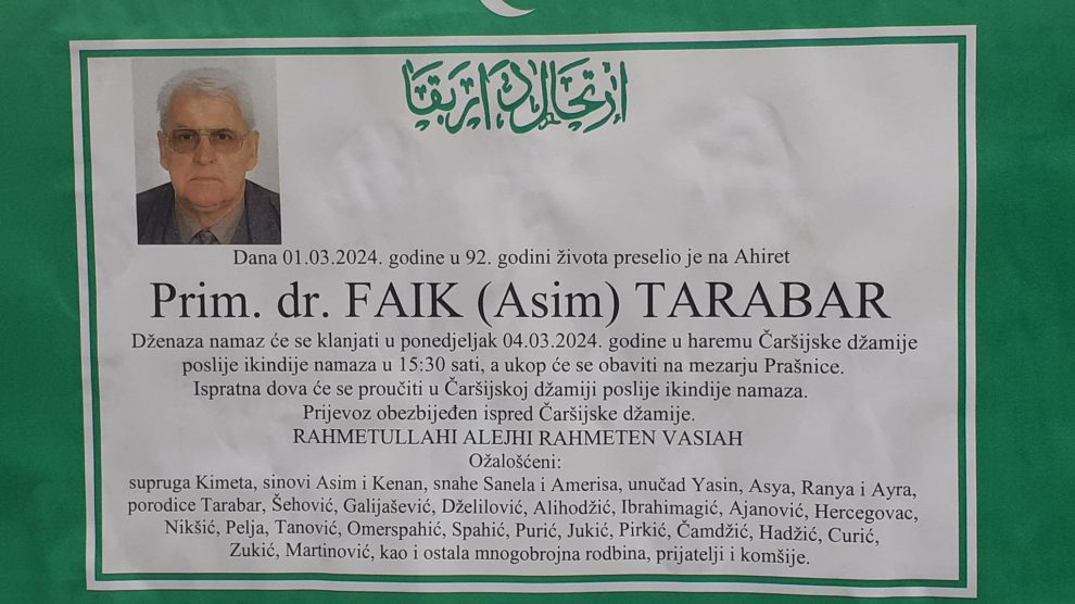 Primarijus doktor Faik Tarabar preminuo je jučer u Zenici, u 92. godini života. Doktor Tarabar je bio dugogodišnji i čuveni načelnik Službe za interne/unuutrašnje bolesti ove ustanove, a mnogim Zeničanima i pacijentima ove bolnice u kojoj je proveo svoj radni vijek poznat kao izvrstan...
