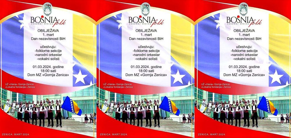 U petak 01.03. u 18h u Domu Mjesne Zajednice Gornja Zenica u organizaciji Ansambla Bosnia Folk, Mjesne Zajednice Gornja Zenica, Udruženje žena Hana Gornja Zenica, OŠ Vladimir Nazor i uz financijsku podršku Lokalne fondacije Zenica, obilježava se Dan nezavisnosti BiH. Prigodnim svečanim...