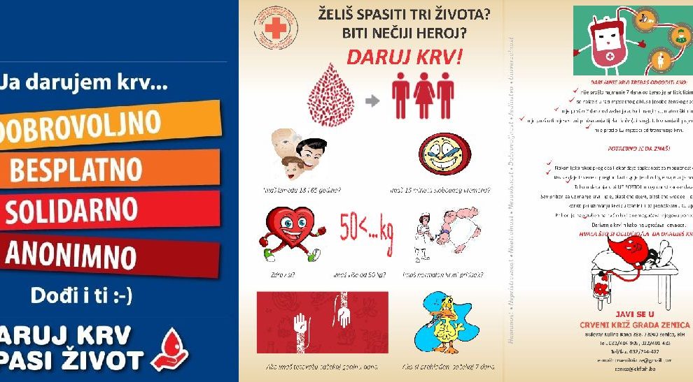 NAJAVA: Akcije darivanja krvi- Crveni križ Grada Zenica organizuje akciju DOBROVOLJNOG DARIVANJA KRVI na dan 14.02.2024. srijeda – u vremenu od 08 do 13 sati u Transfuzijskom centru Kantonalne Bolnice Zenica. Pozivamo naše građane, od 18 do 65 godina, da se odazovu akciji i daruju...