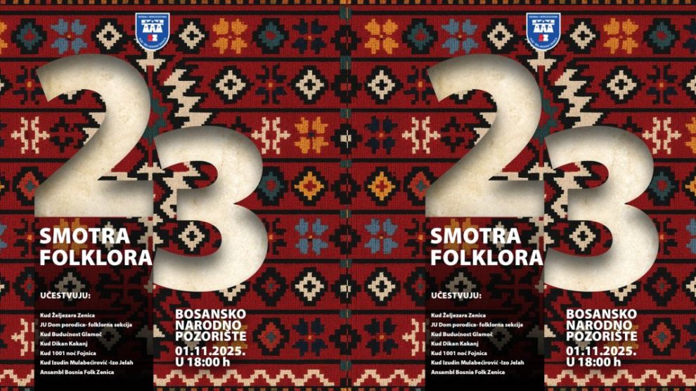 Grad Zenica će i ove godine biti domaćin istinskog praznika kulture, tradicije i narodnog stvaralaštva! U organizaciji Kulturno-umjetničkog društva „Željezara Zenica“, 01. novembra 2025. godine u Bosanskom narodnom pozorištu Zenica, s početkom u 18:00 sati, održat će se 23. Smotra...
