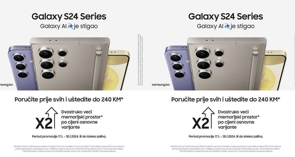 Budi među prvima u svijetu ponosni vlasnik nekog od Samsung Galaxy AI smartphone-a iz dolazeće S24 serije i bićeš nagrađen dvostruko većom memorijom od plaćene!