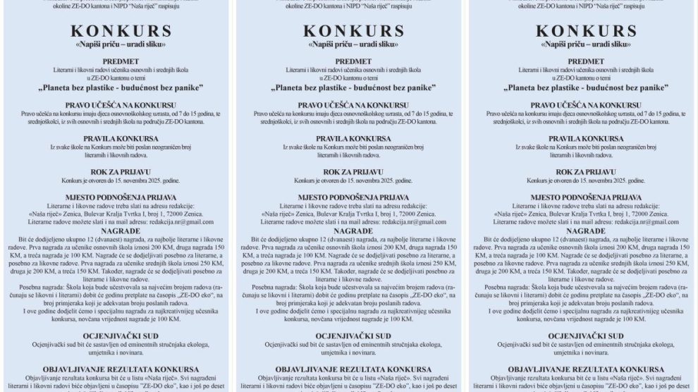 Otvoren je tradicionalni konkurs “Napiši priču-Uradi sliku” kojeg raspisuje NIPD “Naša riječ” u saradnji sa Ministarstvom za prostorno uređenje, promet i komunikacije i zaštitu okoline ZDK. Ovogodišnja tema konkursa je “Planeta bez plastike-budućnost bez panike”, a u skladu je sa motom...