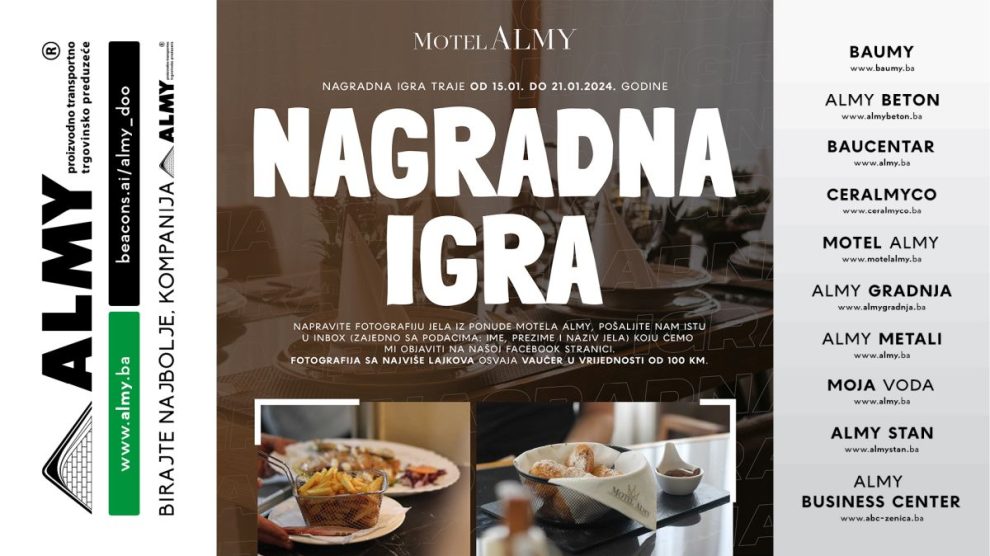 NASTAVLJAMO SA IZNENAĐENJIMA – NOVA NAGRADNA IGRA MOTELA ALMY! Sa zadovoljstvom Vam predstavljamo našu novu nagradnu igru koju smo spremili samo za Vas! Ovaj put možete osvojiti vaučer u vrijednosti od NEVJEROVATNIH 100 KONVERTIBILNIH MARAKA! Pravila igre su jednostavna, a sve što...