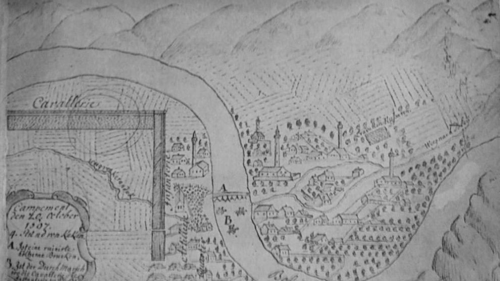 Drveni most, Čaršijska Džamija, sa gornje strane ulica, tada JNA, sa donje Rijeka Bosna. Dosta toga je smješteno na tom prostoru naselja na obali rijeke. Ovoga puta Rijeke Bosne. Sa jedne strane staro naselje Odmut, sa druge strane Čaršija, a gore Londža. Rijeka Bosna šarolika u tom...
