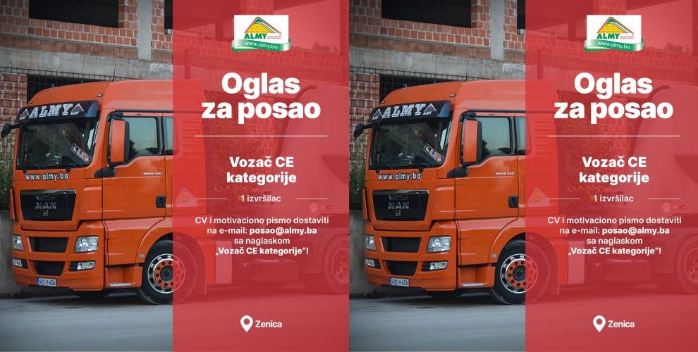 Almy d.o.o. Zenica objavljuje konkurs za prijem u radni odnos: Pozicija: ̌ Lokacija: Broj izvršioca: : – Vozačka dozvola C+E, – Minimalno 1 godina radnog iskustva, – Poželjno radno iskustvo na sličnim poslovima, – Prednost iskustvo u međunarodnom transportu. :...