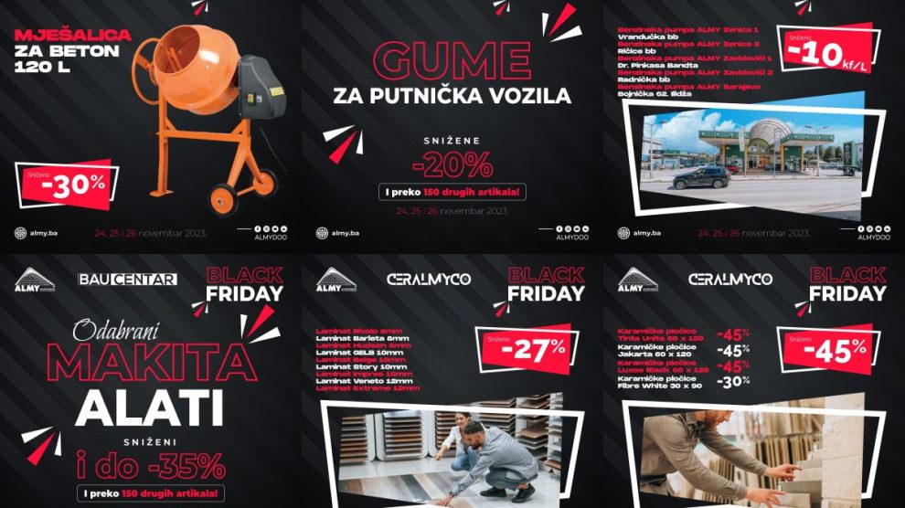 Black Friday vikend u Baucentrima ALMY donosi popuste i do -50% Od 24. do 26.11.2023. očekuju vas tri dana velikih sniženja u BAUCENTRIMA ALMY, SALONIMA CERALMYCO i BENZINSKIM PUMPAMA ALMY Za vas smo snizili cijene za preko 150 proizvoda! ⚫ BAUCENTRI ALMY Ručni i električni alati do -50%...