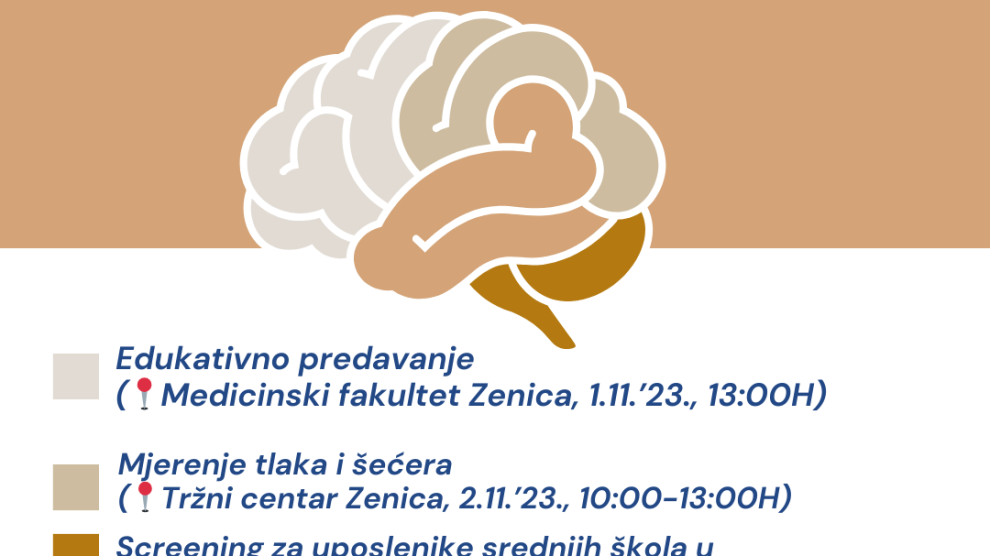 NAJAVA: Aktivnosti povodom obilježavanja “Svjetskog dana moždanog udara”- Svjetski dan moždanog udara se u svijetu obilježava 29. novembra. Ponukani time koliko je važno kontinuirano podizanje svijesti o rizicima moždanog udara, prevenciji istog i učestalosti, te neprestanom...