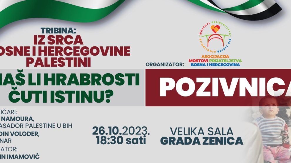 ASOCIJACIJA MOSTOVI PRIJATELJSTVA BiH ORGANIZUJE U ZENICI TRIBINU POD NAZIVOM: “IZ SRCA BOSNE IZ HERCEGOVINE PALESTINI” “IMAŠ LI HRABROSTI ČUTI ISTINU?” Asocijacija Mostovi Prijateljstva BiH organizuje TRIBINU pod nazivom: “IZ SRCA BOSNE I HERCEGOVINE...