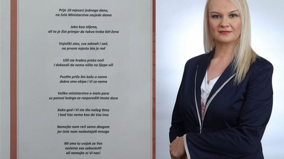 RAJA IZ MINISTARSTVA: Napisali pjesmu za odlazeću ministricu- Proteklih sedmica došlo je do promjene većine u Skupštini ZDK, te je izglasana smjena aktuelne Vlade Zeničko-dobojskog kantona i u narednim danima se očekuje imenovanje nove Vlade. Tom prilikom ministri koji napuštaju trenutne...