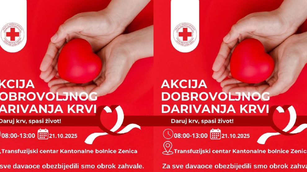 NAJAVA: Akcija dobrovoljnog darivanja krvi- Crveni križ Grada Zenica organizuje akciju dobrovoljnog darivanja krvi koja će se održati 21.10.2025. u utorak u vremenu od 8 do 13 sati u prostorijama Trasnfuzijskog centra KBZ. Pozivamo sve sugrađane da se odazovu i daruju krv jer jedna doza...