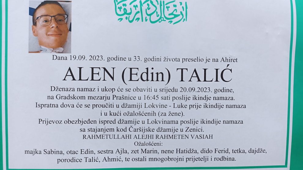 Alen Talić bio je tridesetodvogodišnjak iz Zenice, koji je bolovao od progresivne mišićne distrofije i koji je posljednjih šest godina svog života disao uz pomoć respiratora. Uprkos preprekama, živio je veoma društven i ispunjen život, a njegova interesovanja su bila različita. Dženaza...