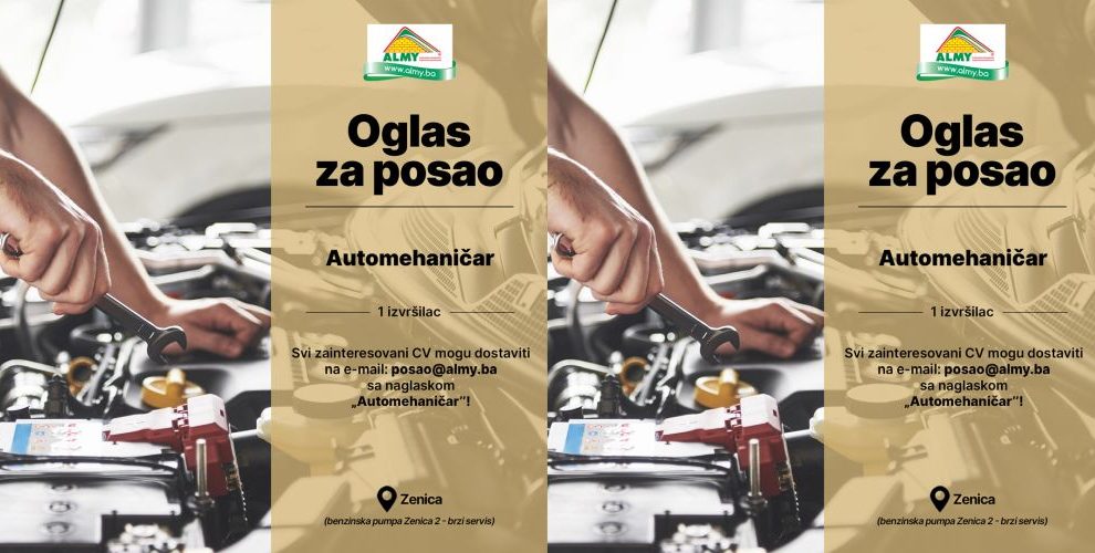 Oglas za posao: Automehaničar- Almy d.o.o. Zenica objavljuje konkurs za prijem u radni odnos: POZICIJA: Automehaničar LOKACIJA: Zenica – Benzinska pumpa ALMY 2 – brzi servis BROJ IZVRŠILACA: 1 POTREBNE KVALIFIKACIJE: – SSS, poželjan smjer automehničar, – Spremnost...