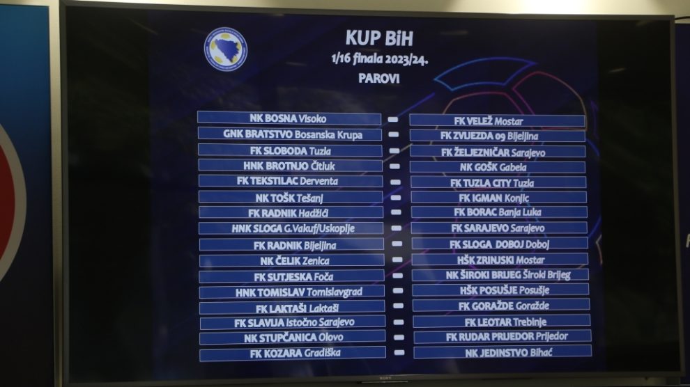 Danas je u Fudbalskom savezu Bosne i Hercegovine obavljeno žrijebanje parova šesnaestine finala Kupa Bosne i Hercegovine. Snage će odmjeriti: Bosna Visoko – Velež Bratstvo Bosanska Krupa – Zvijezda 09 Sloboda Tuzla – FK Željezničar Brotnjo Čitluk – GOŠK Tekstilac...