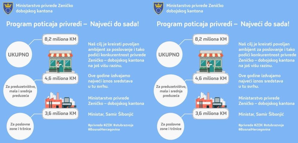 Ministarstvo privrede Zeničko – dobojskog kantona raspisalo 9. augusta ove godine četiri nova Javna poziva u cilju jačanja konkurentnosti privrednih subjekata u ovom Kantonu. “Ostajemo čvrsto opredijeljeni da privredu Zeničko – dobojskog kantona učinimo još konkurentnijom i...