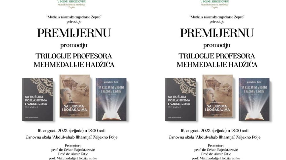 PREMIJERNA PROMOCIJA TRILOGIJE MEHMEDALIJE HADŽIĆA * SA BOŽIJIM POSLANICIMA I VIJESNICIMA * SA LJUDIMA I DOGAĐAJIMA * SA KUR’ ANOM MUDRIM I HADISOM ČASNIM 16. AUGUST (SRIJEDA) u 18:00 SATI U OŠ “ABDULVEHAB ILHAMIJA” ŽELJEZNO POLJE-ŽEPČE Knjige i djela Mehmedalije Hadžića...