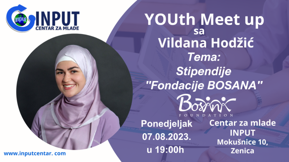 Centar za mlade INPUT organizuje treći po redu YOUth Meet up gdje je cilj informisati, potaknuti mlade ljude da budu aktivni i pomoći im u budućem životu i ostvarenju njihovih planova i ciljeva. Tako ovim trećim YOUth Meet up sa Vildanom Hodžić, stipendistkinjom Bosana Foundation Vam...