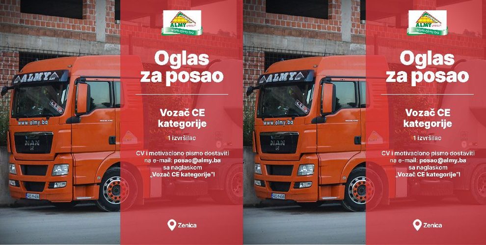Oglas za posao: Vozač- Almy d.o.o. Zenica objavljuje konkurs za prijem u radni odnos: POZICIJA: Vozač CE kategorije LOKACIJA: Zenica BROJ IZVRŠIOCA: 1 POTREBNE KVALIFIKACIJE: – Vozačka dozvola C+E, – Minimalno 1 godina radnog iskustva, – Poželjno radno iskustvo na...