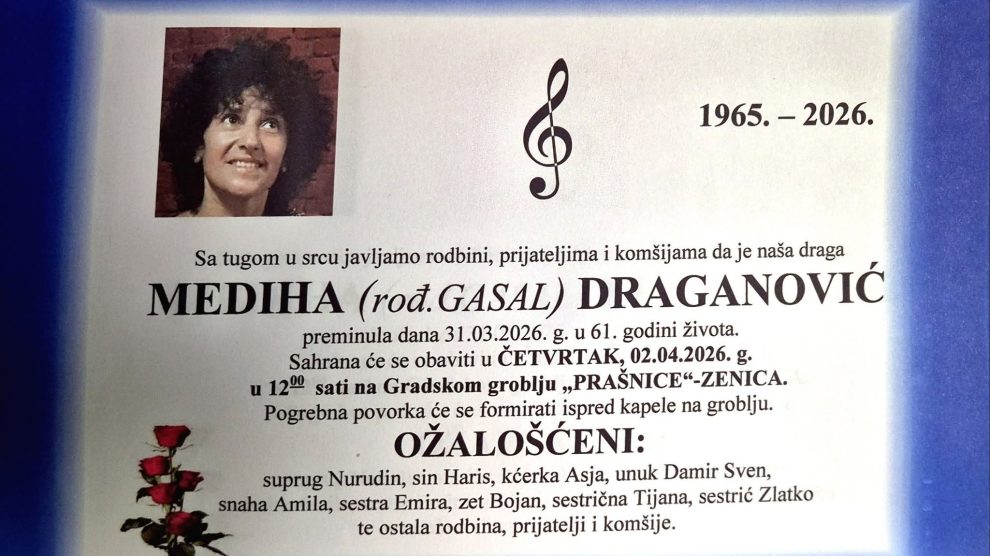 Jučer smo obavjestili NA OVOM LINKU da je naša sugrađanka Mediha (rođ. Gasal) Draganović preminula 31. marta 2026. godine u 61. godini života. Sahrana će se obaviti u četvrtak, 2. aprila 2026. godine u 12:00 sati na Gradskom groblju „Prašnice“ u Zenici, dok će se pogrebna povorka...
