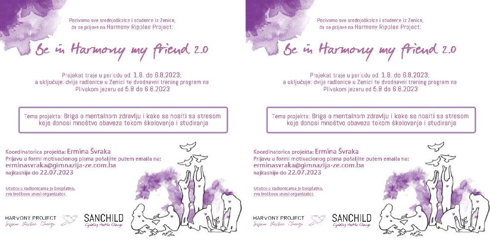 Želite li popuniti svoj raspust nekim korisnim i zabavnim aktivnostima i pri tome naučiti brinuti se o svom mentalnom zdravlju i kako se nositi sa stresom, prijavite se na projekat pod nazivom Be in harmony my friend 2.0 Projekat je namijenjen srednjoškolcima i studentima. Broj učesnika...