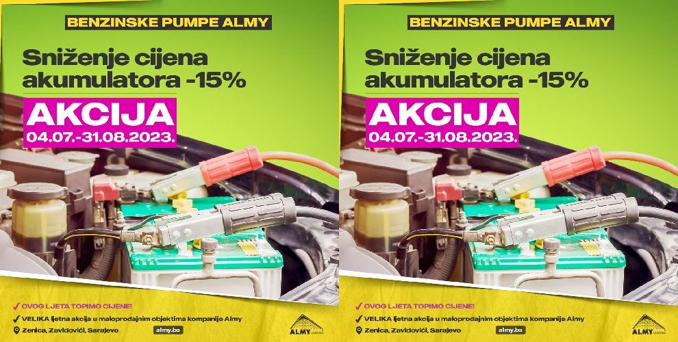 VELIKA ljetna akcija u maloprodajnim objektima kompanije Almy Od 04.07. do 31.08.2023. očekuju vas velika sniženja u maloprodajnim objektima kompanije Almy ☀️ OVOG LJETA TOPIMO CIJENE! Posjetite nas i uvjerite se u nepobjedivo niske cijene i kvalitet usluge ✌️ ✅ BENZINSKE PUMPE &...