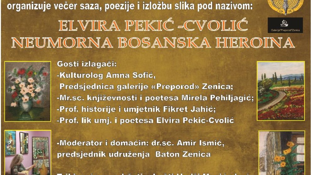 Udruženje “Baton” Zenica organizuje veče saza, poezije i izložbu slika pod nazivom: ELVIRA PEKIĆ CVOLIĆ – NEUMORNA BOSANSKA HEROINA U cilju pozitivne afirmacije građana Grada Zenice, te jačanju patriotskih vrijednosti prema domovini Bosni i Hercegovini, udruženje “BATON” Zenica i...