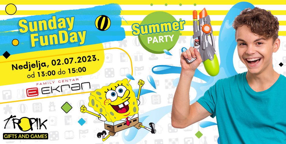 Sunday FunDay “Summer Party “ Pridružite nam se na najboljoj ljetnoj avanturi u gradu- Summer Party sa Spužva Bobom! Pripremili smo mnoštvo aktivnosti koje garantuju puno smijeha i dobrog provoda: Nabaci šlauf – takmičenje u nabacivanju velikih šlaufa za kupanje na marike. Ko će...