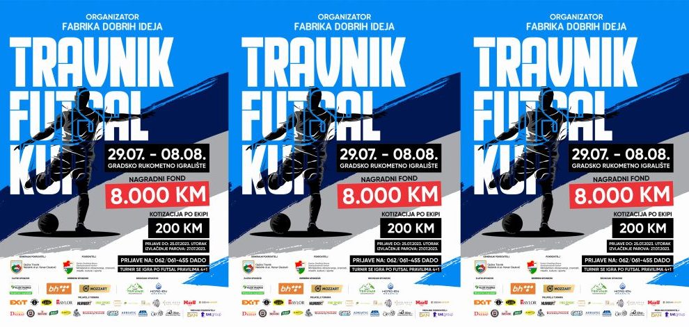NAJAVA: Travnik futsal kup- Nakon više od 20 godina futsal turnir se vraća u Travnik i na gradsko rukometno igralište. Naime, od 29.07. do 08.08.2023. godine u Travniku će se odigrati Travnik futsal kup a organizator je pripremio odlične uvjete za igru i odličan nagradni fond od 8.000 KM...
